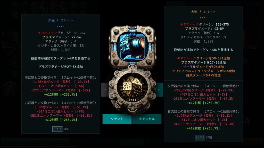 Astrolootでは、装備を選択する際に「装備変更後の比較結果」が常に表示されます。